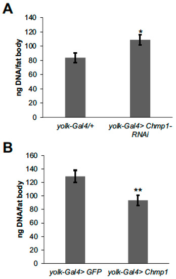 Fat body Chmp1 regulates fat cell number. Fat body DNA content was measured in 1-week-old female (A) yolk-Gal4>Chmp1-RNAi flies and yolk-Gal4/+ controls and (B) yolk-Gal4>Chmp1 flies and yolk-Gal4>GFP controls. Bars indicate mean ± standard error. *, p < 0.05, **, p < 0.01 by Student’s t test.