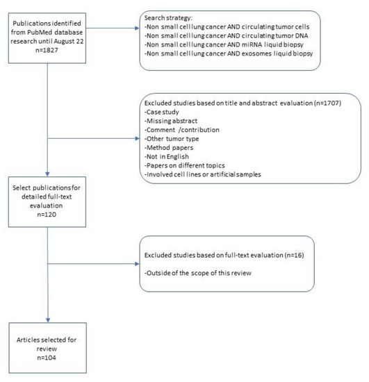 A total of 1827 potential studies were initially evaluated for the review on the results of the bibliographic search. Eligible publications were evaluated by checking the titles and abstracts and 120 full-text articles were selected for further evaluation of full text. Only studies published in English with full text were included. The inclusion criteria were all NSCLC patients studied with a liquid biopsy approach. In the process of assessing the eligibility, we firstly excluded case reports, method papers, comment/contribution papers, missing abstract and articles written in any language other than English. We subsequently excluded studies that involved cell lines or artificial samples.