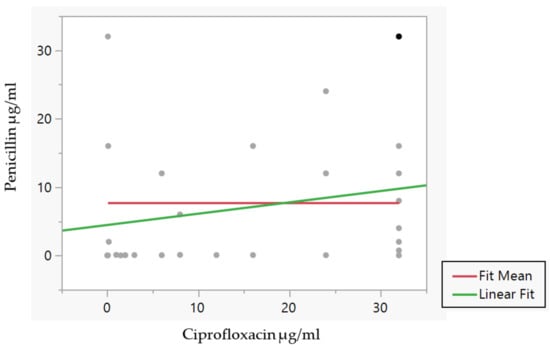 Other relationship associations failed to show any statistical significance, according to the p-values, in the connection between the emergences of resistance in clinical isolates of N. gonorrhoeae. With a lower 95% confidence interval of −0.05, an upper 95% CI of 0.42, and a p value of 0.12, the covariance between penicillin and ciprofloxacin resistance was 32.8 and the correlation was 0.2. The mean level of ciprofloxacin resistance was 19.6 µg/mL, with a standard deviation of 14.1. The R-Squared value for the fit was 0.03, while the F-Ratio and prob > F values for the lack of fit were 0.3 and 0.12, respectively. The intercept’s parameter estimations were 4.5 with a 2.5 standard error. To measure the difference between the antibiotic-resistance means, we utilised the t-value, and we saw that the t-ratio was 1.8 with a prob > t = 0.082 (see Figure 2). Tetracycline and ciprofloxacin resistance were linked with a covariance value of 21.8 and a correlation value of 0.13. The lower 95% confidence interval was 0.11 and the upper 95% was 0.36. The R-Squared value for the fit was 0.02, whereas the lack of fit presented an F-Ratio of 1.8 and prob > F = 0.07. With a 2.1 standard error, the parameter estimates for the intercept were 18.4. To measure the variation in antibiotic-resistance means, we performed the t-value, and we found that the t-ratio was 8.6 with a statistically significant prob > t = 0.001.