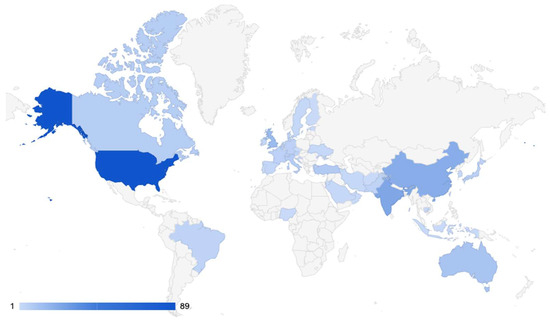 For geospatial trends in publications on ChatGPT in medicine, the country of the senior author was recorded and is presented in Figure 3. The United States had the highest number of publications (89), followed by India (24), China (21), and the United Kingdom (15).