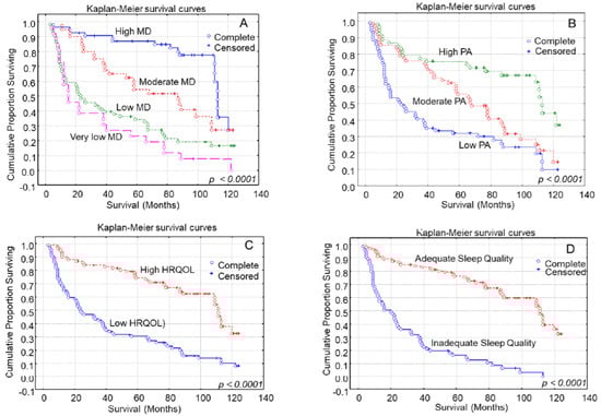 Greater physical activity levels were substantially related with favorable overall patient survival times (Figure 1B, Log-rank test, p < 0.0001). Patients with better health-related quality of life had higher overall survival times compared to those with decreased health-related quality of life (Figure 1C, Log-rank test, p < 0.0001). Patients presenting adequate sleep quality showed longer overall survival times than those presenting inadequate sleep quality (Figure 1D, Log-rank test, p < 0.0001).