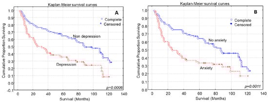 Gastric cancer patients diagnosed with depression exhibited significantly shorter survival times compared to non-depressed patients (Figure 2A, Log-rank test, p = 0.0006). Gastric cancer patients presenting anxiety symptomatology also had shorter overall survival times compared to patients with absence of anxiety symptoms (Figure 2B, Log-rank test, p = 0.0011).