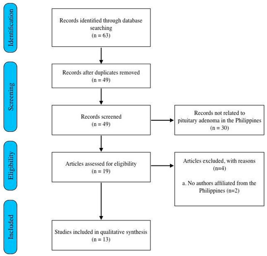 A total of 63 articles were obtained from the search (Figure 1), with 49 articles remaining after duplicates were removed. Thirty articles not related to pituitary adenomas in the Philippines were excluded. Nineteen articles were assessed for eligibility, with two articles excluded because they had no Filipino authors and four articles had only abstracts available. A total of 13 articles were included for synthesis.