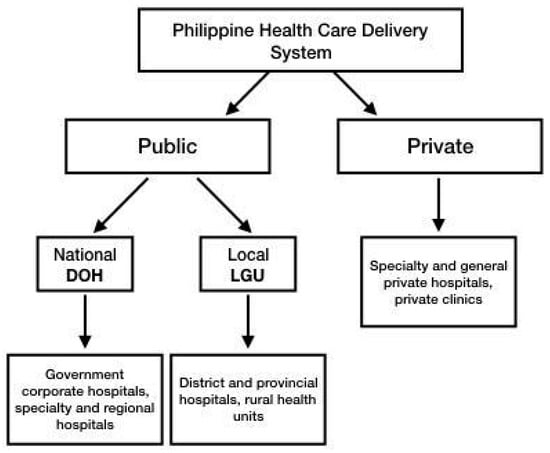 Healthcare in the Philippines is delivered through a dual system composed of the public sector and the private sector [19]. The DOH supervises the government corporate hospitals as well as specialty and regional hospitals, while local government units (LGUs) manage the district and provincial hospitals and other rural health units (Figure 2) [19]. This system is dependent on the premise that the LGUs are the most informed of their constituents’ health needs, thus being able to immediately respond and provide for their needs [19,20]. In addition, the topography of the Philippines, being an archipelago with 7641 islands, also contributes to the maldistribution of health facilities, health personnel, and specialists, especially in isolated rural areas [19].