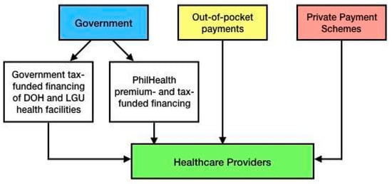 Philippine healthcare financing is a combination of the Beveridgean system (government tax-funded financing of DOH and LGU health facilities), the Bismarckian system (PhilHealth premium- and tax-funded financing), small-pooled private payment schemes, and large unpooled financing, which consists of out-of-pocket expenses as shown in Figure 3 [12].