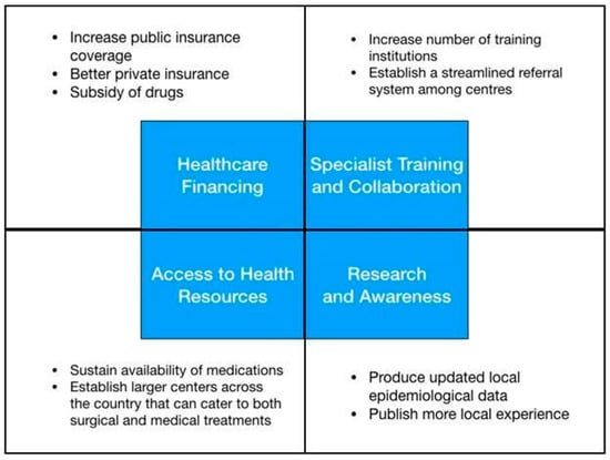 In general, treatment of diseases in the Philippines faces economic, administrative, and social challenges. Figure 4 shows the summary of proposed challenges in the current state of healthcare for patients with pituitary adenomas in the Philippines. Some recommendations on how to address these gaps in treatment are also included. Our review and qualitative analysis revealed that health financing and manpower are the major areas for improvement in the effective management of patients with pituitary adenoma. Access to hospitals where treatments are available, including surgery and radiotherapy, is a resolvable issue. This can be addressed by increasing government healthcare insurance coverage and urging private insurance companies to cover non-emergency cases for brain surgery [30]. In addition, establishment of larger centers across the country to decongest the already crowded and long queues in Metro Manila. The unavailability of some medications in the local market can be solved by increasing availability and volume of these drugs, especially in public pharmacies. Government academic centers together with the DOH can spearhead the procurement process based on need and utilization measures. Also, establishing more training programs to produce more pathology, radiology, radiation oncology, endocrinology, neurology, and neurosurgery graduates may help address the lack of specialists. Promoting international fellowships and training may help in attaining a global standard of care. Producing an updated database on epidemiology and local experience in managing pituitary adenomas will help formulate administrative programs that can further bridge gaps in treatment. Lastly, setting up a streamlined referral system or network based on the working database or registry across different centers that cater to the care of patients with pituitary adenoma will help improve our process flow.