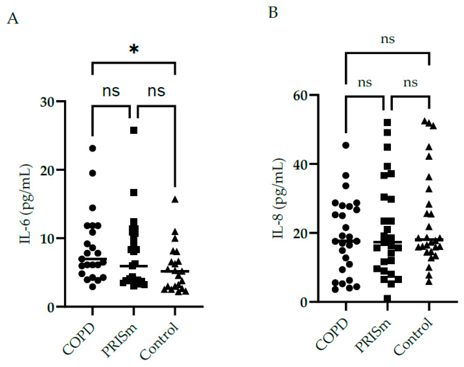 3.2. Evaluation of Hormones and Inflammatory Markers in PRISm and COPD Patients