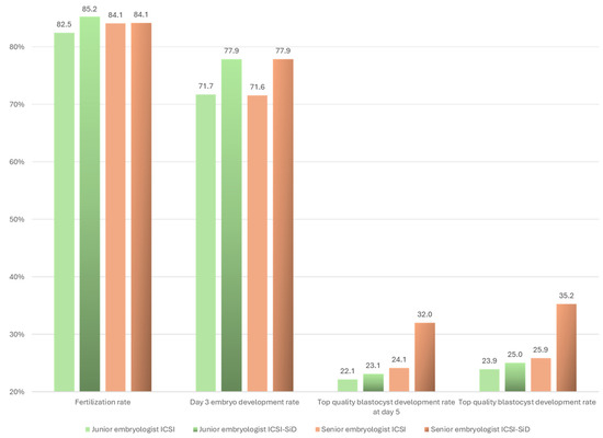 Similarly, a non-significant increase was observed in all biological outcomes including fertilization rate, cleavage rate, day 3 embryo development rate, blastocyst development rate on day 5, good-quality blastocyst development rate on day 5, and top-quality blastocyst development rate on day 5 when sperm selection was performed by a junior embryologist (Figure 2).