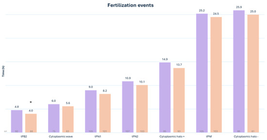 Laboratory outcomes were calculated as described in the Vienna consensus [22]. Embryos displaying less than 10% fragmentation with 4 or 8 cells were considered top-quality embryos on day 2 or day 3, respectively. Blastocyst-stage embryos were graded using the Gardner system [23]. Top-quality blastocysts showed grade A in both trophectoderm and inner cell mass and good-quality blastocysts showed grade A or B trophectoderm and inner cell mass. Embryo development was monitored using a timelapse system (MIRI®, ESCO, Egaa, Denmark), and embryo morphokinetic parameters were annotated manually following the nomenclature previously described [24,25]. The morphokinetics events were annotated only when they could be clearly visualized by the operator. To minimize observer bias in embryo grading and morphokinetic annotation, the method of sperm selection was blinded. Preimplantation genetic testing for aneuploidy (PGT-A) was performed to examine chromosomal abnormalities. Our clinic policy recommends PGTA testing only for the following 3 indications: 1—history of recurrent implantation failure (failure to achieve a pregnancy after 3 transfers of good quality blastocysts); 2—history of repeated pregnancy loss (3 early or 2 clinical miscarriages); and 3—women with advanced maternal age (≥37 years of age). Therefore, only a subset of our patients benefitted from this test. Early pregnancies were assessed by blood hCG detection (>10 U/L). Clinical pregnancies were confirmed by ultrasound assessment of a fetal heartbeat.