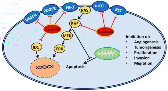 Sorafenib (BAY 43-9006, Nexavar) is an oral, FDA-approved multitargeted tyrosine kinase inhibitor that has been shown to increase survival in renal cell, hepatocellular, and thyroid cancer. [,,]. Initially, sorafenib was identified as a potent RAS/RAF/MEK/ERK pathway inhibitor with additional activity against angiogenesis (i.e., vascular endothelial growth factor receptor [VEGFR-2/3], platelet-derived growth factor receptor [PDGFR]), and tumorigenesis (FMS-like tyrosine kinase 3 [Flt-3], a type III receptor tyrosine kinase [c-KIT], rearranged during transfection [RET]) [,,]. Recently, inhibitor of differentiation 1 (ID1) expression has been shown to be inhibited in NSCLC cells by sorafenib, impacting cell proliferation, invasion, and migration []. Following sorafenib’s approval, other tyrosine kinase inhibitors (TKIs) have been shown to improve treatment outcomes of the aforementioned diseases, but it remains the only approved therapy for hepatocellular carcinoma (HCC) and is commonly used in treatment of solid tumors []. Promising biomarkers such as a high KIT concentration or low hepatocyte growth factor (HGF) have indicated enhanced survival, but none have been validated for clinical use to show responsiveness to sorafenib []. The schematic representation of sorafenib’s mechanisms of action is given in Figure 1.