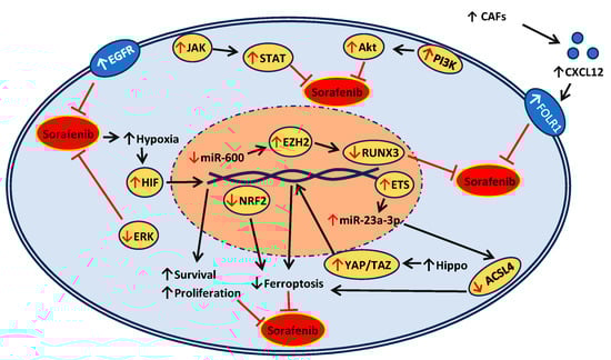 In the Hippo/Yes-associated protein (YAP) signaling axis, the dysregulation of Hippo results in tumorigenesis, promoting YAP/TAZ, which further induces proliferation and chemoresistance to sorafenib through the inhibition of ferroptosis [,]. Further studies in HCC showed that sorafenib-resistant cells increased miR-23a-3p transcription in an ETS Proto-Oncogene 1 (ETS1)-dependent manner, and targeting the key positive regulator of ferroptosis, acyl-CoA synthetase long chain family member 4 (ACSL4), has been shown to overcome sorafenib resistance. A complete review of ferroptosis-related sorafenib resistance can be reviewed in Guo et al. and Wang et al. [,]. Furthermore, other HCC mechanisms of resistance include the activation of cancer-associated fibroblasts (CAFs) via the CXCL12/FOLR1 axis []. Overlapping with clear cell renal cell carcinoma (ccRCC), the nuclear factor erythroid 2-related factor 2 (NRF2)-dependent inhibition of ferroptosis also induces sorafenib resistance []. In a recent in vitro breast cancer study of miR-600, a low expression of miR-600, the inhibition of its downstream target enhancer of zeste homolog 2 (EZH2), an oncogenic histone methyltransferase, and EZH2’s inhibition of tumor suppressor gene runt-related transcription factor 3 (RUNX3), have been shown to cause sorafenib resistance [].