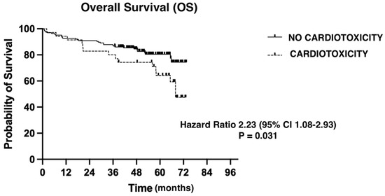 We evaluated overall survival using the Kaplan–Maier method (Figure 1). Median follow-up was 51.83 months (0.76–73.49). The presence of a CTRCD event had a negative impact on OS from any cause (hazard ratio = 2.23 (95% CI: 1.08–2.93); p = 0.031).