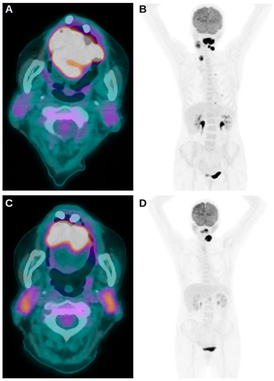 Fused PET/CT (A) and maximum index projection (MIP) (B) images of an [18F]FDG scan performed for staging purposes in a patient with an SCC of the oropharynx. The exam demonstrated the presence of a primary tumor but also of nodal and lung metastases. After undergoing ChT and RT, the subject again underwent a PET/CT scan 5 months later (C,D) that revealed the persistence of local and nodal uptake of the tracer. Four months afterwards, the relapse of disease on the lung and the progression on nodes were demonstrated, and the patient died 2 months later.