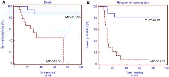 Representative survival curves for OS with baseline MTV(A) and for PFS with restaging MTV (B).