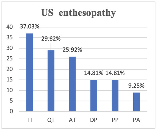 Subclinical enthesopathy, according to OMERACT definitions, was identified in 20 of the psoriasis patients (37.03%), a significant difference compared to controls (5 patients; 10.20%) (Figure 1). The most common site was represented by the triceps tendon (TT) (20; 37.03%), followed by the quadriceps tendon (QT) (16; 29.62%%), Achilles tendon (AT) (14; 25.92%), proximal patellar tendon (PP) (8; 14.81%), distal patellar tendon (DP) (8; 14.81%), and plantar aponeurosis (PA) (5; 9.25%) (Figure 1).