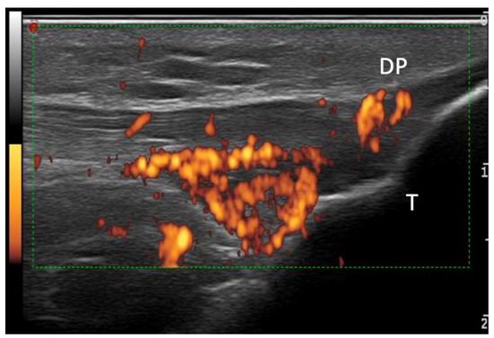 Power Doppler US image of the patellar tendon’s distal enthesis, showing a hypoechoic tendon, with the loss of a homogenous fibrillar pattern primarily near the cortical bone (<2 mm), with an intense power Doppler signal. DP—distal patellar tendon; T—tibial tuberosity.
