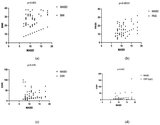Further statistical analysis was conducted to analyze the possible correlation between certain disease-associated variables, demographic factors, and the MASEI score. No association was revealed for disease duration (r = −0.005, p = 0.702), age (r = 0.199, p = 0.147), or ESR (r = 0.12, p = 0.376). We obtained a moderate correlation for BMI (r = 0.41, p = 0.001), CRP (r = 0.406, p = 0.002), and PASI (r = 0.32, p = 0.015) (Figure 4a–e).