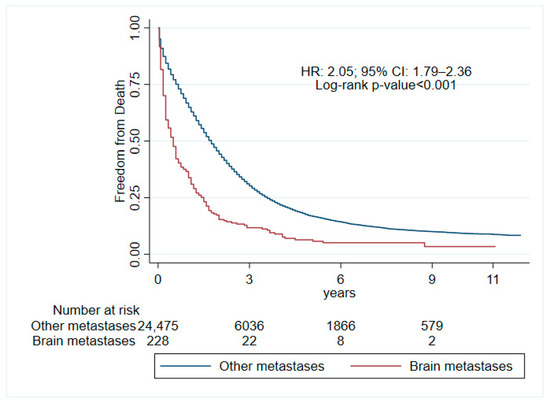 Overall survival of individuals with colorectal cancer and brain metastases compared to other metastatic sites at diagnosis.