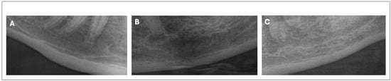 Automatically rectangular images, cropped to the region of interest of the mental foramen: (A) young patients, (B) old patients without osteoporosis, and (C) old patients with osteoporosis.