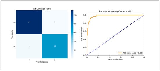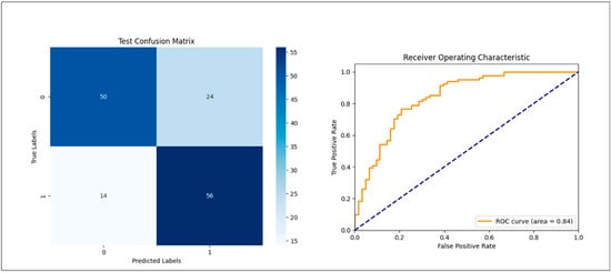 Confusion matrix illustrating, on the left, the detection results of osteoporosis based on PR for an untouched validation set after training and hyperparameter selection and, on the right, the receiver operating characteristic (ROC) curve.