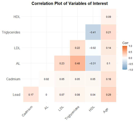 The correlation plot (Figure 1) illustrates the relationships between critical variables, including lead, cadmium, AL, LDL cholesterol, triglycerides, HDL cholesterol, and age, using NHANES 2017–2018 data. Lead and cadmium levels show a weak positive correlation (0.17). AL is moderately positively correlated with triglycerides (0.48) and weakly with LDL (0.23), but moderately negatively correlated with HDL (−0.31). LDL has weak positive correlations with AL (0.23) and triglycerides (0.22). Triglycerides and HDL are moderately negatively correlated (−0.41). Age exhibits weak positive correlations with LDL (0.14), triglycerides (0.10), and HDL (0.21). These findings underscore the interplay between environmental exposures, physiological stressors, and lipid levels.