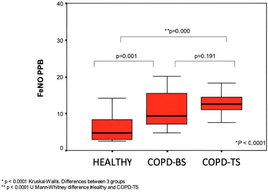 In Table 1, we find the demographic data of the patients included in the study. Significant differences were observed in the forced expiration value (FEV)1 (p < 0.03) between the two groups of patients with COPD. Around 50% of the patients were classified as GOLD IV. The treatments with bronchodilators and steroids were similar for both groups. In the two groups, around 60% were utilizing inhaled steroids. The results of the FeNO measurements of the two COPD groups and the healthy control group are presented in Figure 1, which illustrates that there were statistically significant differences among the healthy subjects and the two COPD groups (p = 0.001), but not between the COPD groups (p < 0.2).