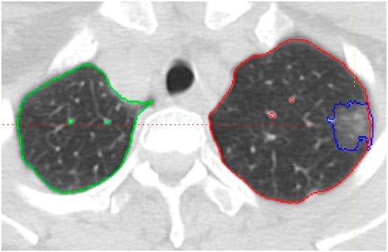 Axial CT image showing the segmentation of a part-solid nodule in the left upper lobe, outlined in blue. The right and left lungs are outlined in green and red, respectively. Vessels are segmented separately to distinguish them from the lung parenchyma.
