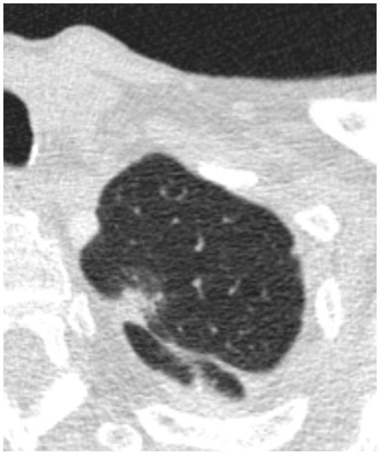 CAD-based texture analysis of nodules for characterization was performed on the same baseline non-contrast CT scan obtained before the biopsy with 1 mm slice thickness at B30f reconstruction. The CT images were imported to an in-house-developed software package, the Quantitative Imaging Workstation (QIWS) developed at UCLA for segmentation and further image analysis. This workstation has a variety of automated and semi-automated CAD and measurement tools. Automatic segmentation function was applied slice-by-slice for each nodule by an operator trained at identifying and segmenting nodules (SJ). Each slice was then carefully reviewed, and manual corrections to the segmentation were made as necessary. Thereafter, a radiologist with 23 years of experience (FA) reviewed the segmentation, performed necessary segmentation adjustments, and finalized the segmentation. A sample of the segmentation is shown in Figure 1. Quantitative features were extracted from the regions of interest using the QIWS software (Version 1), as previously mentioned. These features included shape, intensity histogram statistics, and texture features derived from gray-level co-occurrence matrices (GLCM). Through CAD-based texture analysis, 95 variables were generated, categorized into 11 histogram features, 4 size features, and 80 GLCM texture features (as detailed in the Supplementary Materials). The radiomics calculations followed the Image Biomarker Standardization Initiative (IBSI) guidelines [12].