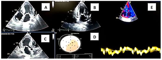 Transthoracic Doppler Echocardiogram Study. Source: authors, 2021. (A) 4-chamber apical section demonstrating septal thickening, interatrial septum and atrioventricular leaflets. (B) 2-chamber apical section demonstrating thickening of inferior and anterior walls. (C) 5-chamber apical section denoting ventricular thickening and mitral valve leaflets and visualization of the aortic valve. (D) Polar map with a total longitudinal global strain: −5%. Doppler ultrasound with (E) significant drop in tissue velocities is observed; e’ wave of 0.03 m/s at the septal level.
