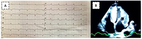 Source: authors, 2021. (A) Electrocardiogram demonstrating first degree AV block, complete right bundle branch block and inferior pseudo infarction. (B) Apical 4-chamber image shows a very thickened 24 mm interventricular septum and thickened interatrial septum, as well as the mitral valve leaflets and mild pericardial effusion.