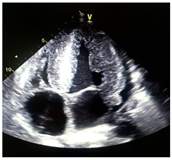 Source: authors, 2021. Apical 4-chamber image shows a very thickened 26 mm interventricular septum, thickened interatrial septum and atrioventricular leaflets and pericardial effusion.