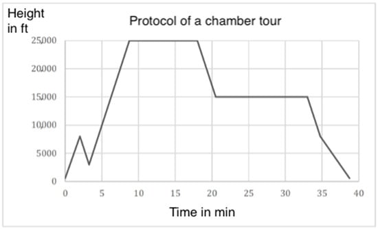This was followed by a test ascent to 8000 ft (rate v = 4000 ft/min) with subsequent pressure increase back to 3000 ft (v = 2000 ft/min) to ensure smooth sinus pressure equalization via the Eustachian tube. The actual ascent to 25,000 ft (v = 4000 ft/min) then occurred. At this plateau, a hypoxia simulation was performed by decreasing FiO2 from 100% to 21%, allowing participants to identify their individual hypoxia symptoms within a maximum of 5 min.