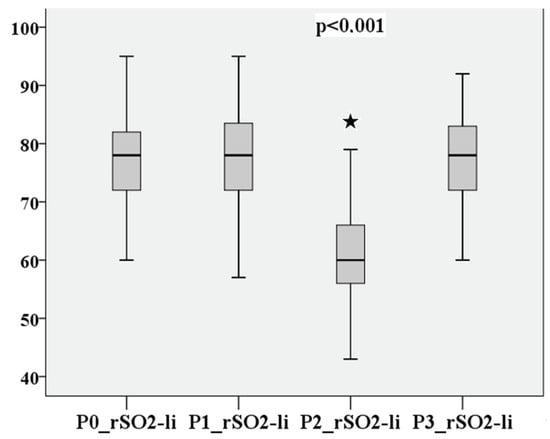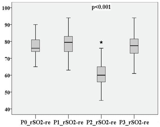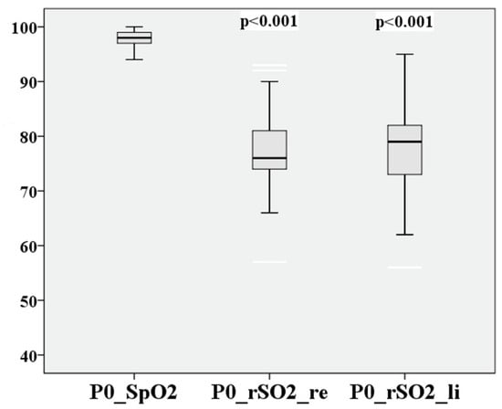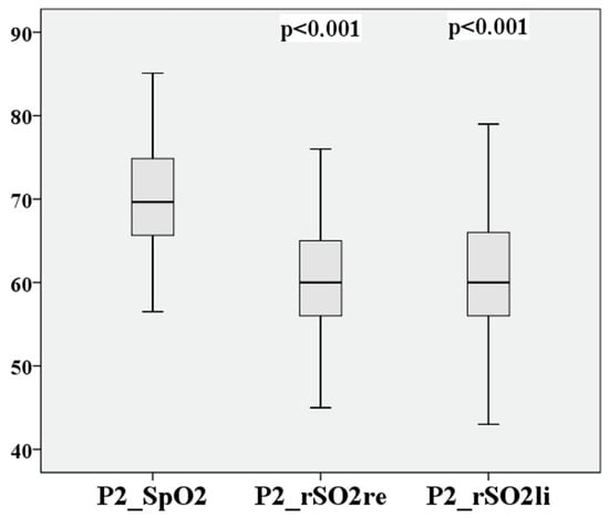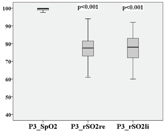The measurement points P0–P3 are directly compared in Figure 12, Figure 13, Figure 14 and Figure 15 for cerebral and peripheral measurements to graphically represent the comparability of the two measurement methods. The difference in rSO2 and SpO2 is highly significant at each of the defined time points (p < 0.01).