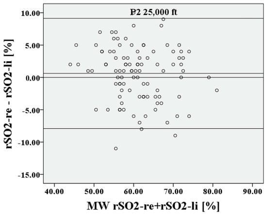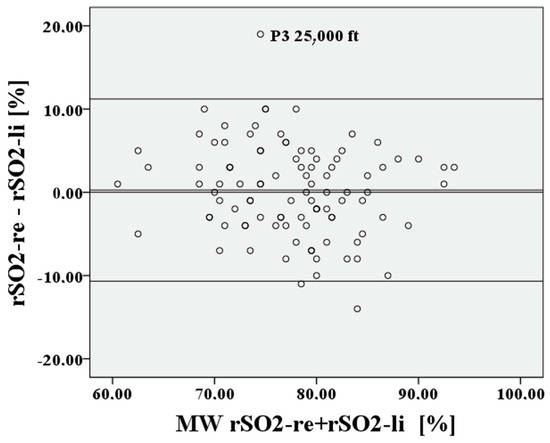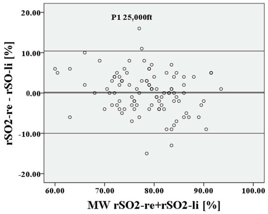 Subsequently, for the value P1, i.e., before hypoxia, a Bland–Altman diagram is shown in Figure 6 and Figure 7.