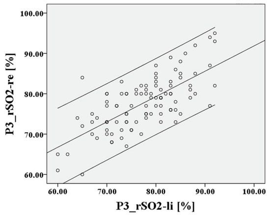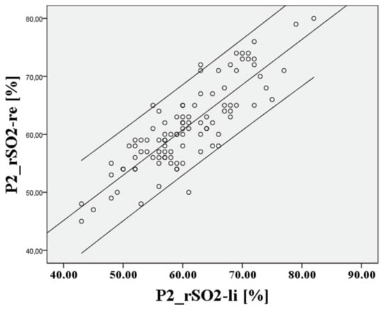 The deviation of the rSO2 measurements between right to left is approximately 0.21 percentage points, the 95% confidence interval lies between 10.41% and −9.99%, the limits of agreement (LoA) are clinically acceptable at 10.2%, and Lin’s concordance correlation coefficient (CCC) is moderate at 0.753. For P2, cerebral saturation on the right and left is also represented in Figure 8 and Figure 9 using a Bland–Altman diagram.
