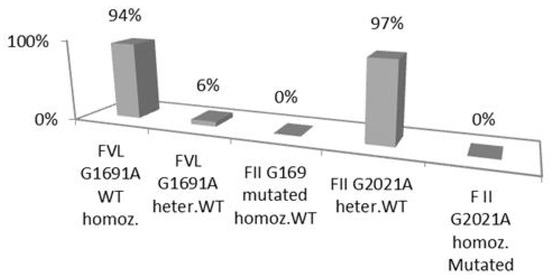 The observed frequencies of the FVL and FII prothrombin genotypes investigated in our study were similar to those reported for Caucasian populations. The frequency of polymorphism of factor VL G1691 homozygous wild-type was 94% and 6% of heterozygous type, while factor II G2021A was 97% homozygous wild-type and 3% heterozygous type. Mutant homozygosity was not present in any of the two above polymorphisms. The finding allele frequencies were as follows: factor VL: 97% for the ancestral allele and 3% for the mutated allele; factor II: 100% ancestral allele, 0% mutated allele.