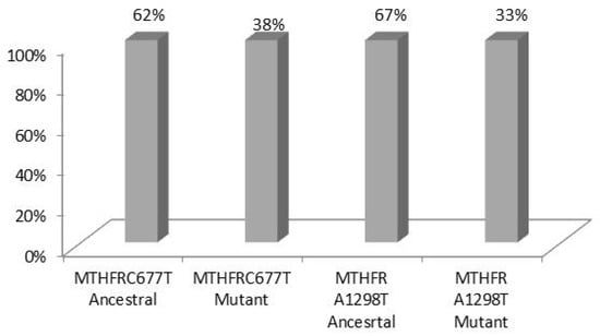 The allele frequencies (expressed as a % percentage), detected were for MTHFR C677T 62% for the ancestral allele, 38% for the mutant allele and for MTHFR A1298G 67% for the ancestral allele, and 33% for the mutant allele (Figure 3).