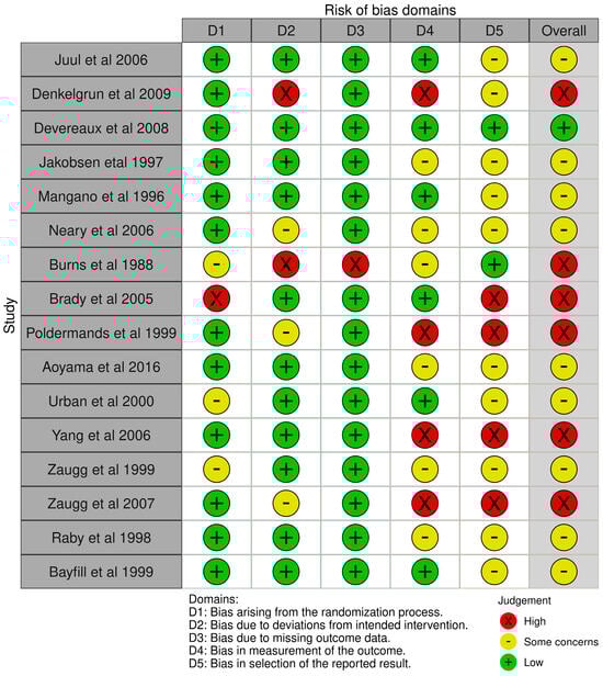 - Sterne, J.A.C.; Savović, J.; Page, M.J.; Elbers, R.G.; Blencowe, N.S.; Boutron, I.; Cates, C.J.; Cheng, H.-Y.; Corbett, M.S.; Eldridge, S.M.; et al. RoB 2: A revised tool for assessing risk of bias in randomised trials. BMJ 2019, 366, l4898. [Google Scholar] [CrossRef]
