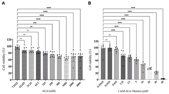 Determination of A549 viability using MTT assay after (A) ALA and combined (B) ALA-hemin addition followed by light irradiation. The most toxic concentration of ALA reduced the cell viability to ~70%, while the highest concentration of the combined treatment reduced the viability to 2.2%. (n = 8, ns, not significant; **, p < 0.01; ***, p < 0.001; and ****, p < 0.0001). The distribution of each experimental replication is presented as the black dots.