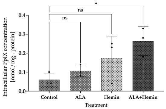 Changes in intracellular PpIX accumulation after ALA and hemin addition. A one-way analysis of variance (ANOVA) and Tukey’s test were performed to detect differences in mean values between treated and non-treated samples (n = 3, ns, not significant; *, p < 0.1). The distribution of each experimental replication is presented as the black dots.