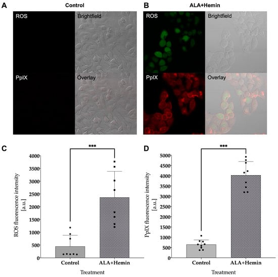 Confocal microscope observation of PpIX and ROS in (A) control A549 cells and (B) after ALA-hemin treatment. The quantitative measurement of PpIX and ROS in (C) the control group and (D) after being treated with ALA-hemin. Quantitative data were expressed as mean with ±SD, analyzed with one-way analysis of variance (ANOVA), and Tukey’s test to confirm differences in the statistical significance of each treatment (n = 8, ***, p < 0.001). The distribution of each experimental replication is presented as the black dots.