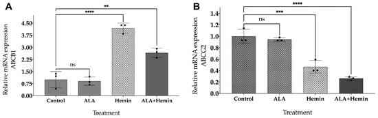 Changes in relative gene expression of two PpIX transporters, (A) ABCB1 and (B) ABCG2, after ALA and hemin addition. A one-way analysis of variance (ANOVA) and Tukey’s test were performed to detect differences in mean values between the treated and non-treated samples (n = 3, ns, not significant; **, p < 0.01; ***, p < 0.001 and ****, p < 0.0001). The distribution of each experimental replication is presented as the black dots.