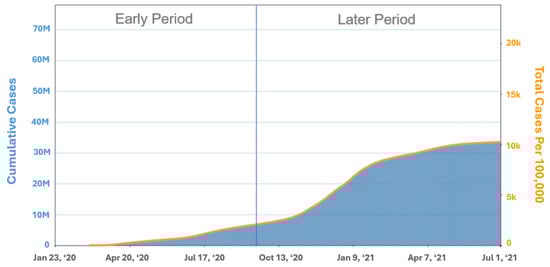 Study definition of early and late period of the COVID-19 pandemic. Trends in Total Cases and Cumulative Incidence Rate of COVID-19 Cases in the United States Reported to CDC, per 100,000 population (https://covid.cdc.gov/covid-data-tracker/#trends_totalcases Accessed on 4 September 2021) are available on the agency site at no charge. Use of CDC materials in this publication does not constitute endorsement or recommendation by the U.S. Government, Department of Health and Human Services, or Centers for Disease Control and Prevention.