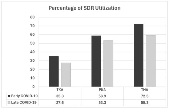 Percentages of patients utilizing only SDR as guided by the sbCMP by procedure and period of the pandemic (early, March–September 2020; late, October 2020–July 2021).