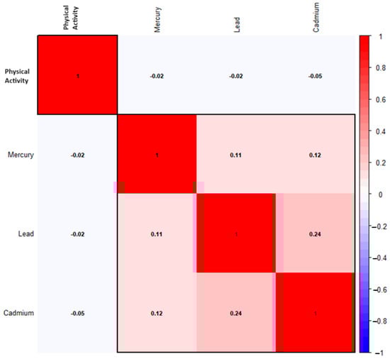 This study concentrates on these three heavy metals known for their toxic effects, persistence, and environmental prevalence. These metals act as threats to human health and exhibit strong associations with physical activity. Lead and cadmium are neurotoxic metals that can adversely affect cognitive abilities and motor skills. Exposure to lead, for example, has been closely linked to reduced fine motor skills and impaired executive function, which affects the central nervous system and limits the ability to carry out physically demanding tasks [12]. Exposure to multiple metals, such as lead, mercury, and cadmium, can amplify their harmful effects. Research indicates that combined exposure leads to more severe cognitive and motor impairments compared to exposure to a single metal. This is primarily due to disruptions in neurotransmitter systems, which result in behavioral and neurological changes that may contribute to reduced levels of physical activity [13].