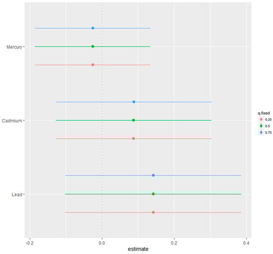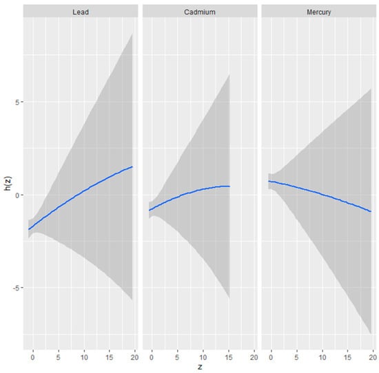 In Figure 7, which examines the effects of individual metals while fixing other metals at specific quantiles, the credible intervals similarly provide essential context for interpreting the results. Lead and cadmium show positive trends, while mercury trends were slightly negative. However, the credible intervals for all metals include zero, reinforcing the uncertainty around these estimates. This underscores the Bayesian framework’s emphasis on probabilistic interpretation rather than frequentist concepts such as statistical significance.