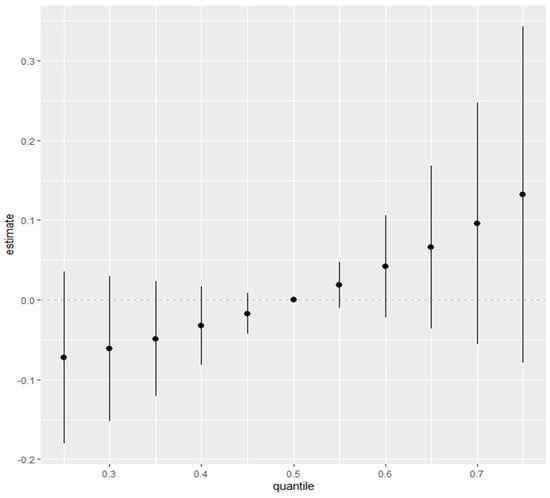 Figure 6 represents the overall exposure effect derived from the BKMR model, illustrating how the estimated impact of combined metal exposures varies across different quantiles of the exposure distribution. The y-axis indicates the estimated effect on the outcome variable, physical activity, while the x-axis denotes the quantiles of the exposure mixture. The general trend observed in the plot is an upward slope, suggesting that as the quantile of exposure increases, the estimated effect on physical activity becomes more positive. This pattern implies that higher levels of combined metal exposures are associated with higher levels of physical activity. The vertical bars on the plot represent the 95% credible intervals, illustrating the uncertainty surrounding the effect estimates. These intervals widen at higher quantiles, indicating greater uncertainty in the effect of high exposure levels on physical activity. Figure 6 suggests a positive trend in the relationship between combined metal exposures and physical activity. However, the credible intervals crossing zero at all quantiles indicate substantial uncertainty in the posterior estimates, suggesting that the data do not provide strong evidence for a consistent association. Within the Bayesian framework, this reflects variability in the estimated effect sizes and highlights the importance of cautious interpretation, as the posterior distribution captures a range of plausible values rather than definitive proof of a relationship. In Figure 6, the x-axis (“quantile”) represents the quantiles of all predictors fixed at specific percentiles (e.g., 25th to 75th), while the y-axis (“estimate”) indicates the overall estimated effect of the predictors on the outcome (depression) relative to the reference level (50th percentile).