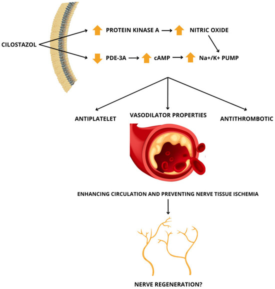 Experimental studies using animal models have evidenced an improved motor neuron conduction velocity, along with the restoration of myelinated fiber density and size [46,48,59,60,61]. More specifically, some studies have concluded that cilostazol influences myelin fiber morphology. By blocking neurogenic inflammation and reducing the number of macrophages at the site, this drug appears to promote the supply of cytoskeletal proteins, thereby reducing axon atrophy [48,62]. The effects of cilostazol on the development of experimental diabetic neuropathy were studied in rats with induced diabetes, where this drug enhanced the activity of the Na+/K+ pump. As a result, alterations in the metabolism of prostaglandins and nitric oxide facilitated improvements in endoneural microvascularization, correcting blood flow and alleviating neural hypoxia [46]. Additionally, the authors reported an increase in the nerve conduction velocity associated with enhanced sodium and potassium pump activity [46]. Yamamoto demonstrated that cilostazol, as an antiplatelet drug with vasodilatory effects, effectively prevented a decrease in the axonal regeneration rate following cryolytic injury to the sciatic nerve in streptozotocin-induced diabetic rats [48]. This study suggested that the improvement in nerve regeneration may be attributed to cilostazol’s ability to mitigate diabetes-related complications such as ischemia and hypoxia [48]. In an analysis of the effects of cilostazol on peripheral neuronal function and structure in diabetic rats, cilostazol inhibited a reduction in the pericyte area in the endoneurial vessels and decreased the expansion of the endoneurial microvessels and the luminal area in relation to the vascular area, both of which are deleterious effects resulting from DM [62].