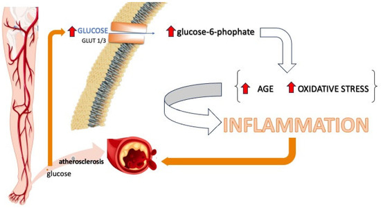 Glucose enters the vascular endothelium through glucose transporters 1 (GLUT1) and 3 (GLUT3). These transporters facilitate the passive diffusion of glucose along the concentration gradient, meaning they do not rely on insulin for transport [70]. The presence of GLUT1 and GLUT3 explains why hyperglycemia leads to elevated glucose concentrations in the vascular endothelium [71]. An excess glucose concentration in the vascular endothelium leads to an increase in glucose-6-phosphate [72], which activates the nuclear factor kappa B (NF-kB) pathway and stimulates Toll-like receptors (TLRs) [73,74]. These trigger elevated expression of inflammatory cytokines and adhesion molecules, contributing to vascular dysfunction and the development of both microvascular and macrovascular complications in diabetes [75,76]. Moreover, hyperglycemia induces oxidative stress, further amplifying the inflammatory response, a critical factor in the pathogenesis of atherosclerosis in diabetic patients (Figure 2) [24,77].