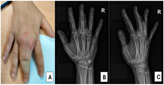 Figure 1. (A) Right hand showing a lobulated, cystic-appearing mass; (B,C) X-rays of the right hand revealing calcifications localized in the proximal phalanx of the third finger.